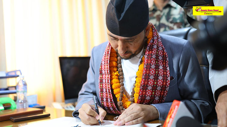 सञ्चार मन्त्री जगदिश खरेल आफ्नो मन्त्रालयमा पदभार ग्रहणपछि नयाँ निर्णायमा हस्ताक्षर गर्दै