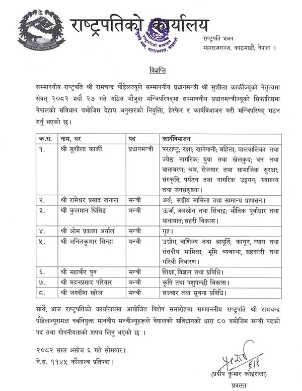 ‘जेनजी’ समूहको आन्दोलनले केपी शर्मा ओलीको सरकार पदस्त भएपछि सुशीला कार्कीको नेतृत्वमा २७ भदौमा नयाँ सरकार बनेको हो । यो सरकारमा प्रधानमन्त्री सुशिला पछि तीन जना मन्त्री नियक्त भएका थिए । त्यसपछि आज फेरी चारजना मन्त्री नियुक्त भएका हुन् । यो चारजनाको नियुक्तीसँगै ८ जनाको मन्त्री मण्डल बनेको छ । आज नियुक्त भएका चार जना मन्त्रीले नै आ आफ्नो मन्त्रालय पुगेर पद ग्रहण गर्दै जिम्मेवारी सुरु गरेका छन् ।