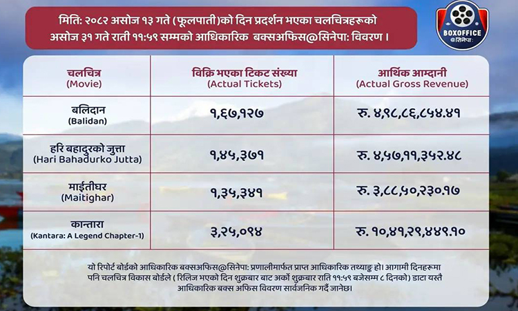 यसपालिको दसैंको तुलनामा तिहारमा रिलिज भएको ‘जेरी अन टप’को व्यापार सुखद छ । दसैँमा एकसाथ तीन नेपाली चलचित्र रिलिज हुँदै तीन वटै चलचित्रको व्यापार सोचे भन्दा कम थियो । यसरी जुध्दा सबैभन्दा ठुलो असर चलचित्र ‘बलिदान’लाई प¥यो भने ‘बलिदान’ बक्स अफिसमा फ्लप साबित भयो । बाँकी दुई चलचित्र ‘हरिबहादुरको जुत्ता’ र ‘माइतीघर’ पहिलो पनि चलचित्र घरमा प्रदर्शन भइरहेको छ । यी तीन चलचित्र र दसैँमा रिलिज भएको भारतीय चलचित्रको व्यापार यहाँ उल्लेख गरिएको छ ।