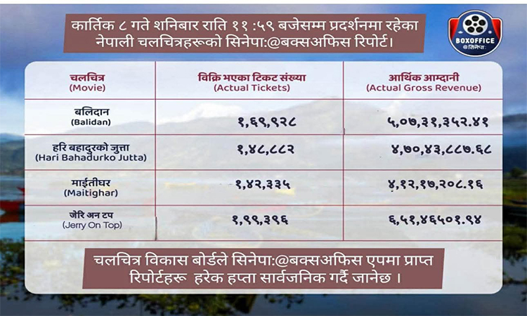 यस्तै दसैँदेखि तिहारसम्म रिलिज भएका तीन नेपाली चलचित्र बलिदान, हरिबहादुरको जुत्ता र माइतीघरको हालसम्मको बक्स अफिस रिपोर्ट पनि बोर्डले सार्वजनिक गरेको छ । सो रिपोर्ट तल तस्बिरमा उल्लेख छ ।