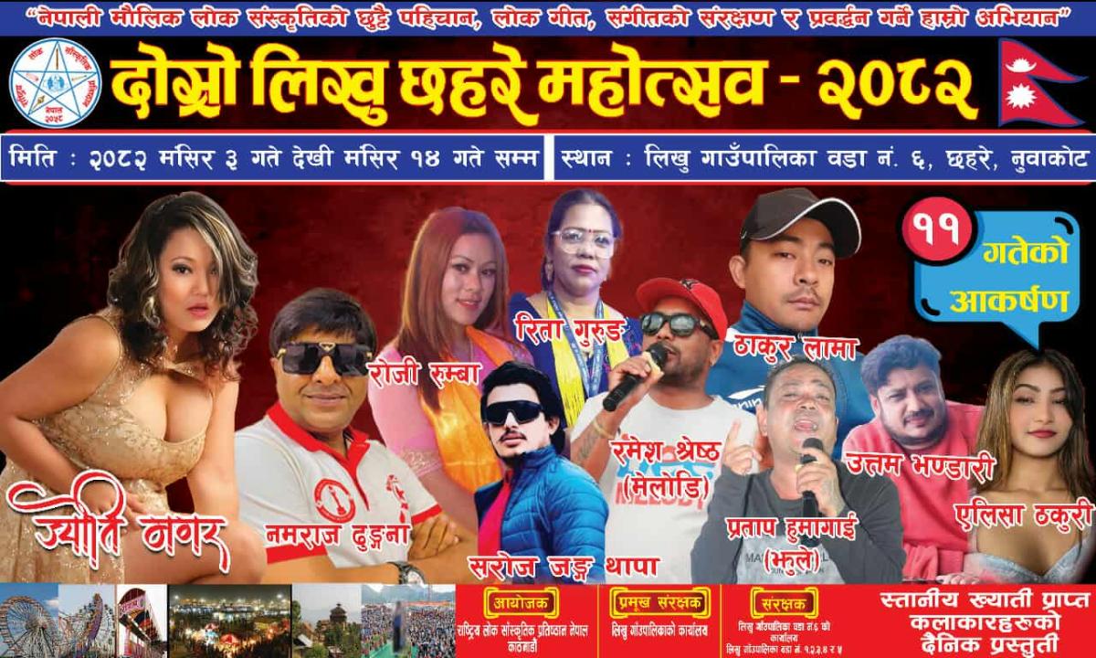 नुवाकोटको लिखु गाउँपालिका वडा नं. ६ स्थित छहरे बजारमा बिगत एक हप्तादेखि चलिरहेको ‘दोस्रो लिखु छहरे महोत्सव २०८२’मा हरेक दिन दिउँसो २ बजेपछिबाट सांगीतिक कार्यक्रम सुरु हुने गरेको छ । सो सांगीतिक कार्यक्रममा देशका राष्ट्रिय तथा स्थानीय कलाकारहरुले गीत, संगीत, नृत्य तथा प्रहसन प्रस्तुत गरिरहेका छन् । यसै क्रममा आज बिहीबार दिउँसो यो महोत्सवमा स्थानीय कलाकारसँगै लोकप्रिय गायिका ज्योती मगरको भव्य प्रस्तुति रहने छ ।