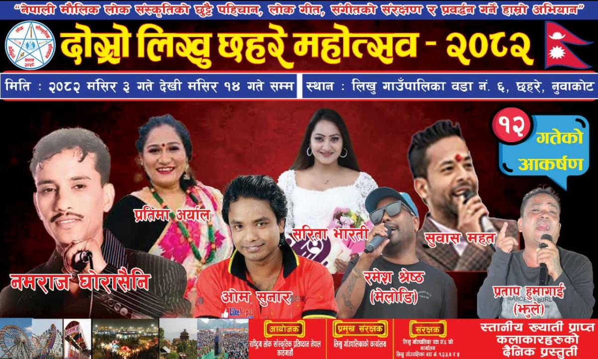 नुवाकोटको लिखु गाउँपालिका वडा नं. ६ स्थित छहरे बजारमा बिगत ९ दिन देखि ‘दोस्रो लिखु छहरे महोत्सव २०८२’ चलिरहेको छ । यो महोत्सव लिखु गाउँपालिकाको सहयोग तथा राष्ट्रिय लोक सांस्कृतिक प्रतिष्ठान नेपालद्धारा आयोजनामा ३ मंसिरबाट छहरेमा भव्य रुपमा चलिरहेको हाृे । यस महोत्सवमा विभिन्न स्थानीय कृषी उत्पादनको बिक्रीसँग सांस्कृतिक प्रस्तुतिहरु नियमित रुपमा हुने गरेको छ । महोत्सवका अध्यक्ष नमराज ढुंगानाका अनुसार स्थानीय उत्पादन तथा कृषी उत्पादनहरुलाई महोत्सवमा प्रवर्धन गरिएको छ ।