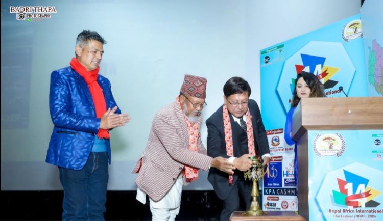 काठमाडौँको चाबहिल स्थित चलचित्र विकास बोर्डको प्रांगनमा शुक्रवारबाट १४ औँ संस्करणको ‘नेपाल अफ्रिका अन्तर्राष्ट्रिय चलचित्र महोत्सव २०२६’ सुरु भएको छ । महोत्सवको उद्घाटन बोर्डका अध्यक्ष दिनेश डिसी, नेपाल ललितकला प्रज्ञा प्रतिष्ठानका कुलपति नारदमणि हार्तम्छालीले शुक्रवार संयुक्त रूपमा गरे । कलेज अफ जर्नालिजम एन्ड मास कम्युनिकेशन र विलक्षण क्रियसनको आयोजना तथा चलचित्र विकास बोर्डको सहकार्यमा यो महोत्सव सुरु भएको हो ।