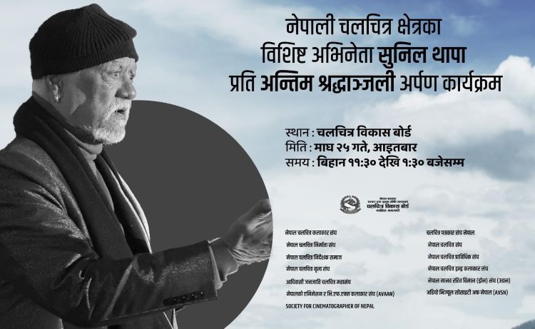 नेपाली द्धिग्गज अभिनेता सुनिल थापाको शनिबार बिहान निधन भएको हो । उनको आज आइतबार दिउँसो श्रद्धाञ्जली कार्यक्रमसहित अन्त्यष्टी गरिने भएको छ । आज बिहान ११ः३० देखि दिउँसो १ः३० सम्म चलचित्र विकाश बोर्डमा उनको श्रद्धाञ्जली कार्यक्रम राखिएको छ । चलचित्र विकास बोर्डले एक सूचना जारी गर्दै सबैलाई श्रद्धाञ्जलीमा सहभागी हुन अपिल गरेको छ ।