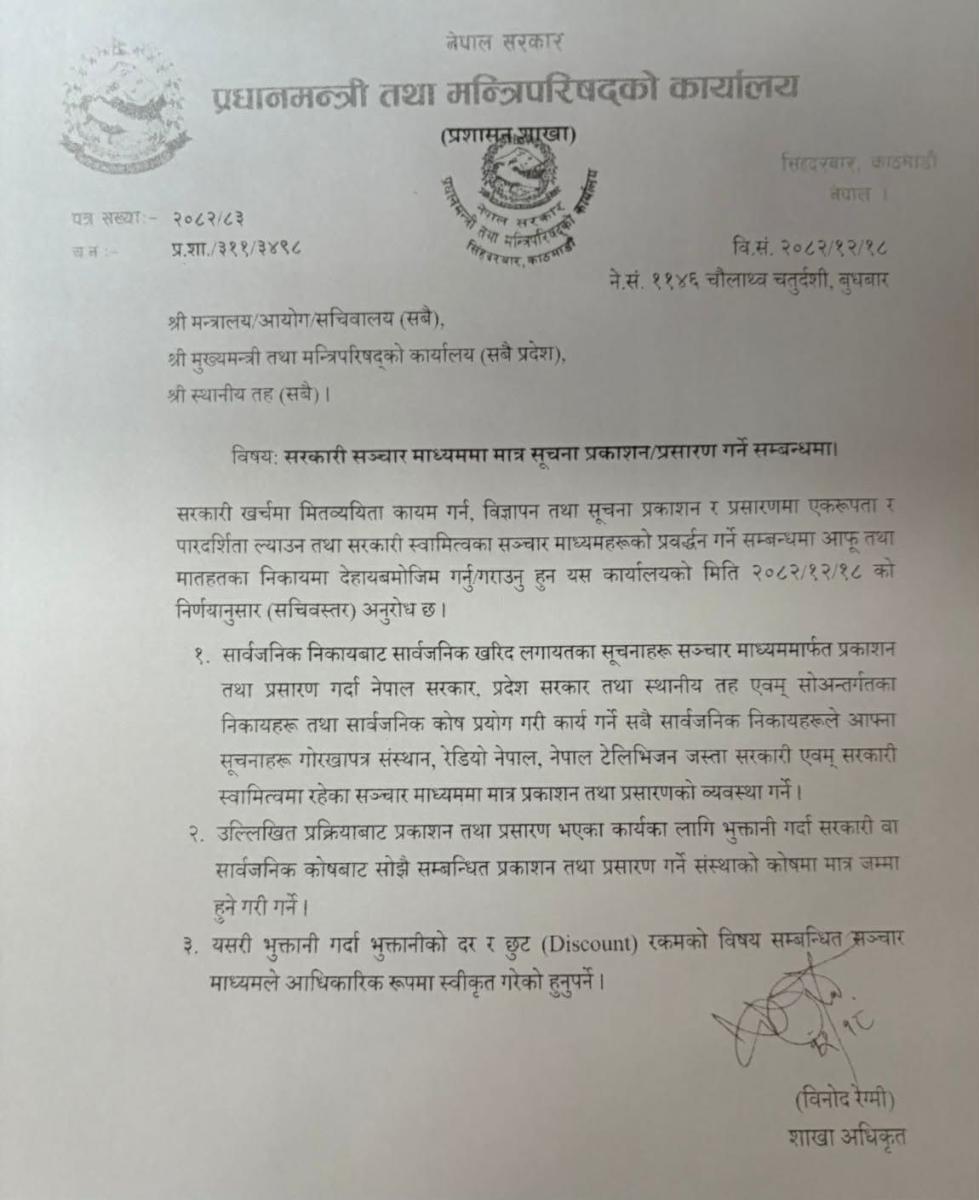 नेपाल सरकारले अबबाट सरकारी विज्ञापन सरकारी मिडियो गोरखापत्र, नेपाल टेलिभिजन, रेडियो नेपाल लगायतलाई मात्र दिने निर्णय गरेको छ । सो निर्णयको चलचित्र पत्रकार संघ नेपालले एक विज्ञप्ति मार्फत भत्सना गरेको छ । संघका महासचिब रघुनाथ सापकोटाद्धारा जारी विज्ञप्तिमा यस्तो लेखिएको छ ः