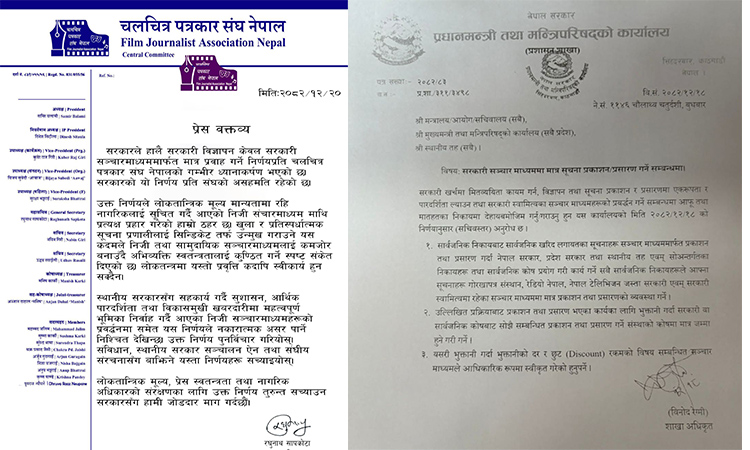 ‘सरकारले हालै सरकारी विज्ञापन केवल सरकारी सञ्चारमाध्यममार्फत मात्र प्रवाह गर्ने निर्णयप्रति चलचित्र पत्रकार संघ नेपालको गम्भीर ध्यानाकर्षण भएको छ। सरकारको यो निर्णय प्रति संघको असहमति रहेको छ।